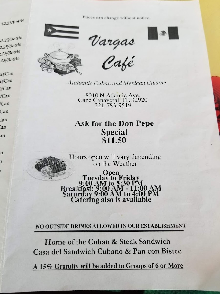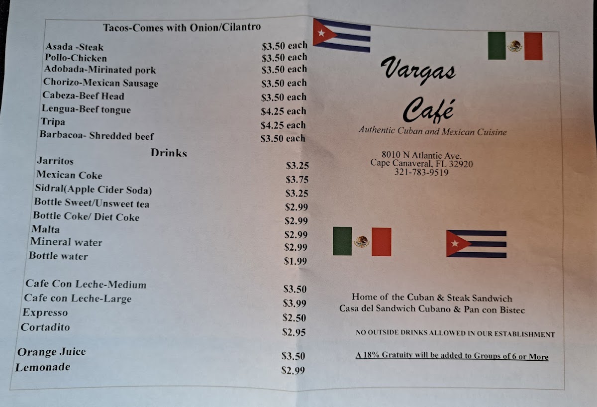 At Vargas Cafe, located at 8010 N Atlantic Ave, Cape Canaveral, FL, you’ll find a menu filled with fresh, delicious options that are sure to satisfy your cravings. Whether you're in the mood for a hearty breakfast, a light lunch, or a sweet treat, there’s something for everyone. Start your day with a warm, comforting bowl of oatmeal or indulge in their signature breakfast burrito, packed with flavorful ingredients. For lunch, try the savory sandwiches or fresh salads, perfect for a quick bite or a relaxing meal. Don't forget to save room for dessert - the homemade pastries and cakes are a must-try! Vargas Cafe Menu is all about quality ingredients and comforting flavors, designed to make every meal feel special. Every dish is prepared with care, ensuring you leave with a smile and a satisfied appetite.